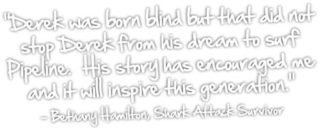 Laird Hamilton and more, who are featured in this new surfing movie and christian film. You will learn from Derek’s story that the best journeys in life are walked by faith, and not by sight. Derek’s story of intense perseverance despite a physical disability grabbed the interest of film maker Bruno Lemos who caught the realization of Derek’s dream—surfing Pipeline—in a surfing movie. The short surf clip found its way to YouTube, and then to Bryan Jennings, director/producer of surf industry films such as Walking on Water and the christian movie Bethany Hamilton’s Heart of A Soul Surfer. Walking On Water films and S4J Hawaii Productions have partnered together to produce this very special Beyond Sight surf film.